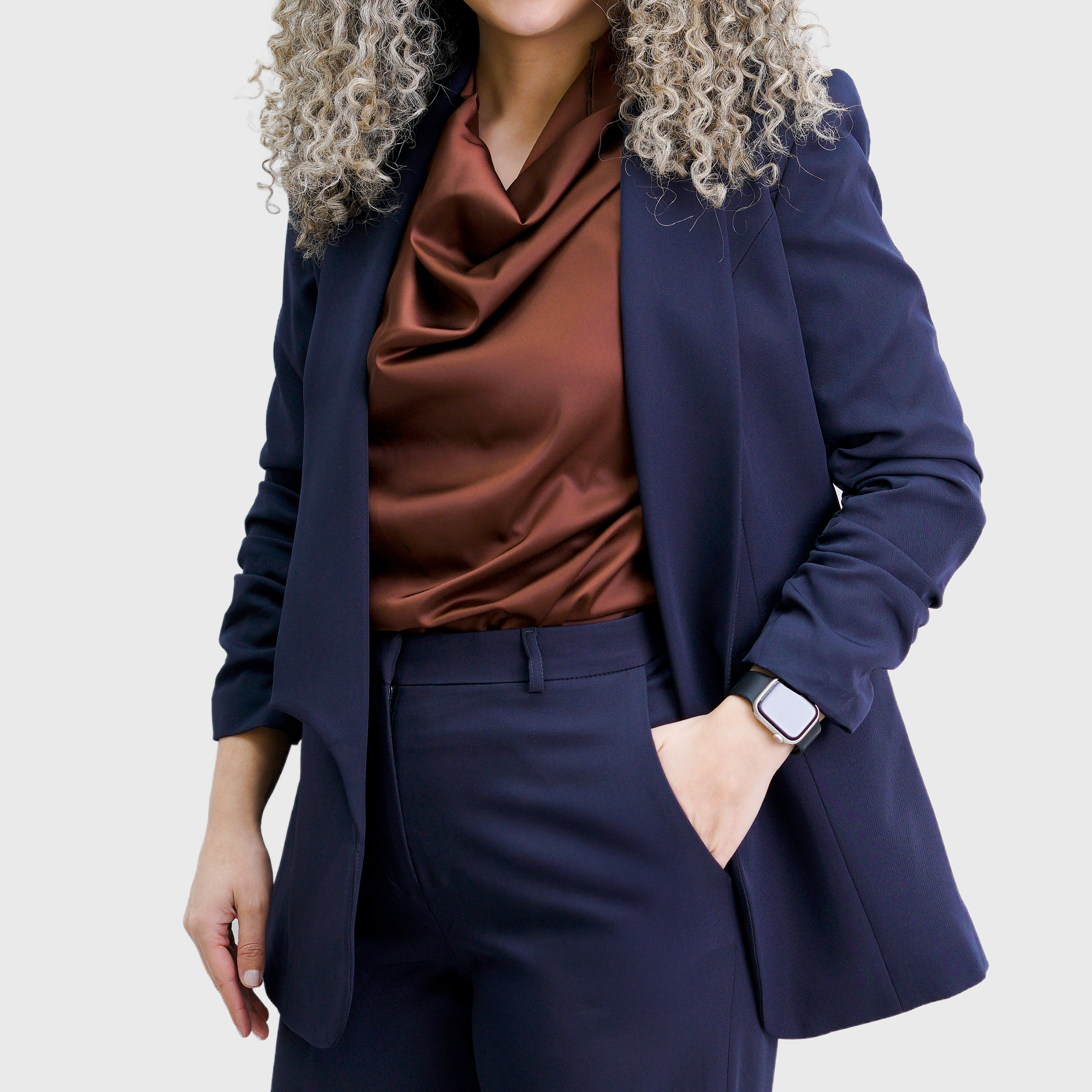 Navy-Blue Long Blazer with an extended shawl collar and elasticated ruched sleeves