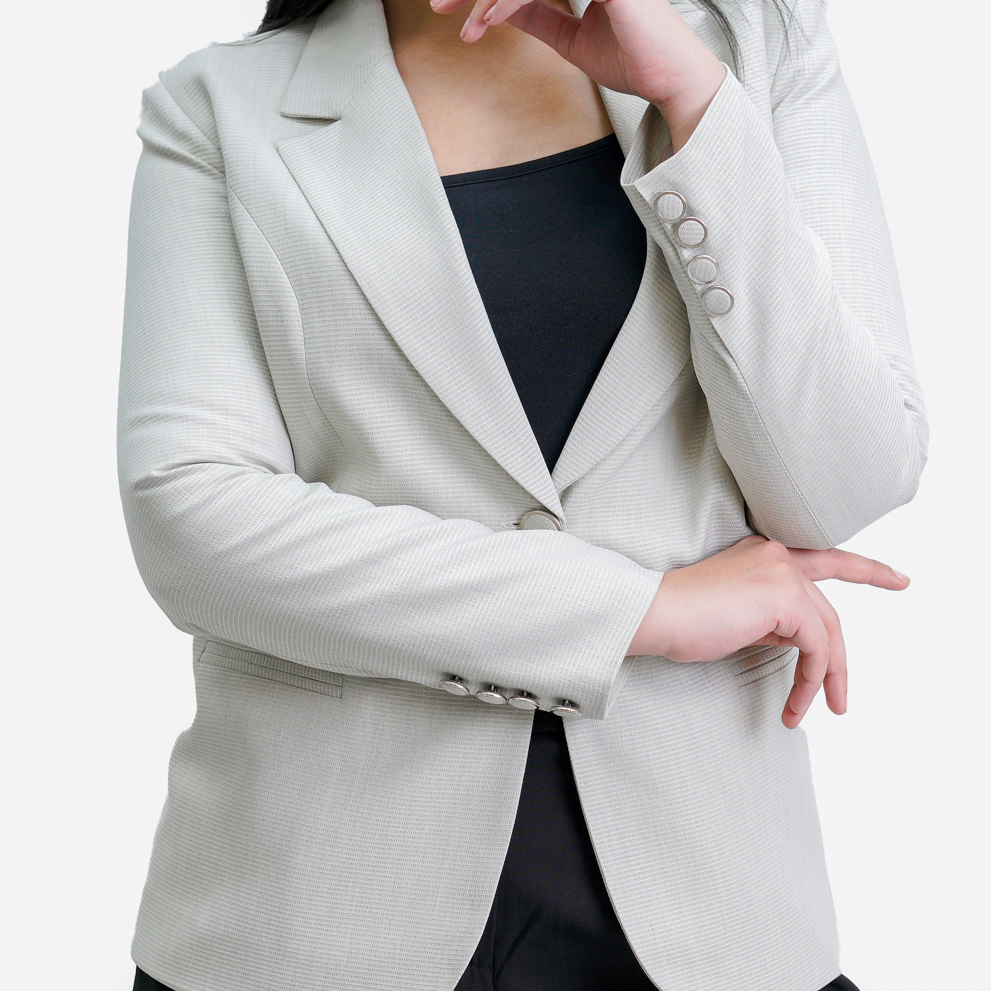 Blazer with long sleeves, notched lapel collar, single front button, and four buttons on each sleeve