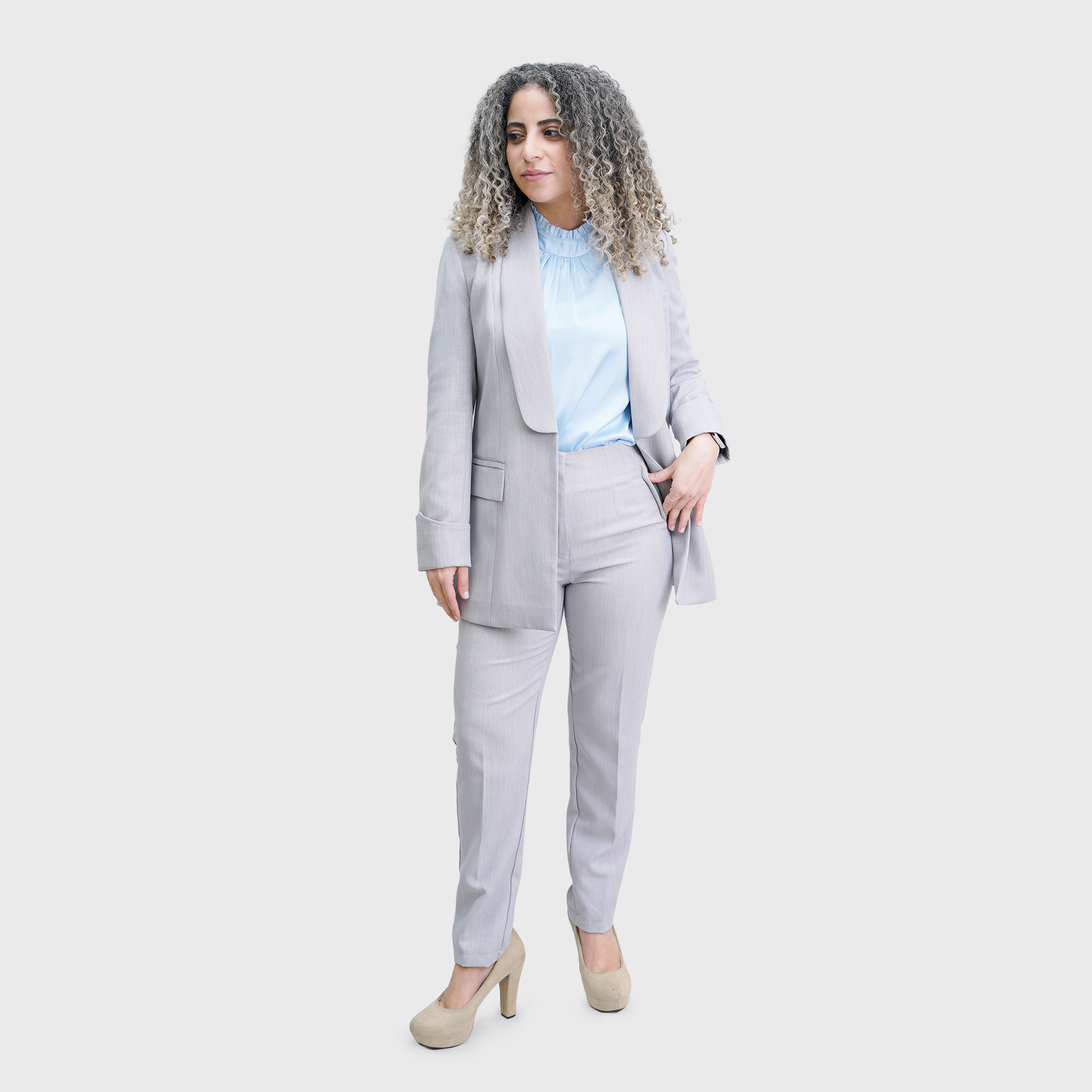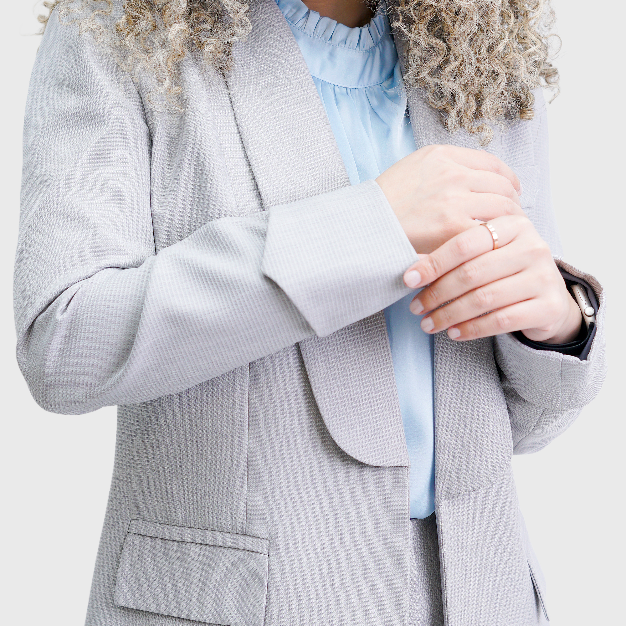 Light Grey Long ribbed Blazer with long sleeves, plain folded cuffs, and an extended shawl collar